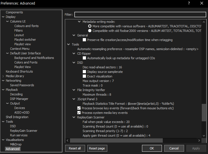 2세대, 0번대에서 출발했으니 실제로는 3세대 foo_input_sacd-2.X.X 시리즈는 DSD를 완전히 분리 독립시켰고, 아울러 기존의 DSD+PCM은 제거되었숩니다. 또한 DSD 직접 시각화가 가능해졌는데, 사용 권장하지 않습니다. 특별한 경우가 아니라면 푸바 어드밴스드 DSD 설정은 다음 사진의 디폴트 값을 그대로 두는 게 좋습니다.