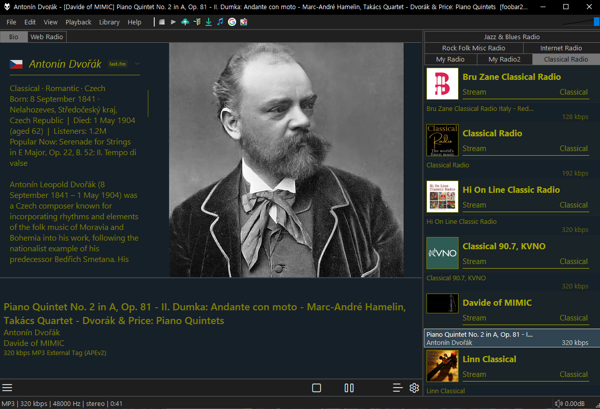 클래식 인터넷 라디오 플레이리스트의 Bru Zane Classical Radio 주소가 변경되었습니다. 새 주소 것 더하기 mp3 320kbps의 Davide of MIMIC 영국 클래식 전문 방송국 더한 것을 네이버 박스 푸바 공유 폴더 foobar2000 64bit v2.25.2 Versions에 올렸습니다. 아룰러 방송국 명 더하기에 필요한 익스터널 태그를 최신 v1.5.16으로 업데이트했습니다. 제 버전들에서는 익스터널 태그 업데이트가 불필요하나 상대 경로 문제를 해결한 최신 것을 설치하는 것이 바람직 ... 해당 버전들은 인터넷 라디오 장르별 플레이리스트를 장착한 다음 버전들입니다.
