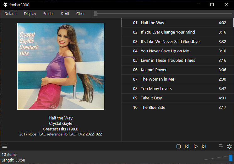 현재 개인 원고 작업 장소에서 사용하는 푸바 베이식(foobar2000 Basic) ... 그곳 모니터가 24인치인데 상단에 걸어두고 음악들으면서 작업하기에 적합한 작은 크기의 플레이어입니다. 모양은 단순합니다.